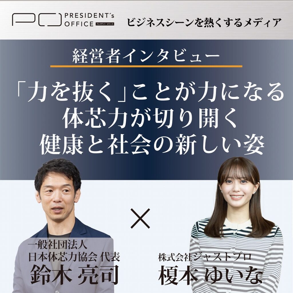 先日、ビジネス情報サイト「PRESIDENT OFFICE(プレジデントオフィス)」さんに体芯力について取材をしていただきました。 記事では、「力を抜く」ことが力になる ─ 体芯力が切り開く健康と社会の新しい姿をテーマに、怪我からの学び、呼吸と脳の関係、そ... -